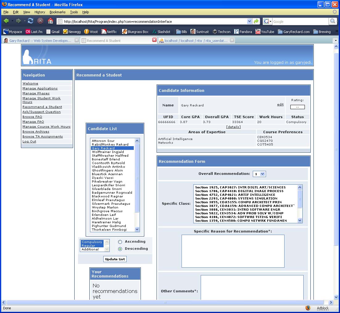 This system was designed by J.C. Jones, Mikel Mazlaghani and myself as a project for a graduate level Software Engineering course. Its purpose is to handle the assignment of various students as Teaching Assistants for various courses in the Computer Information Science and Engineering (CISE) department at the University of Florida.
